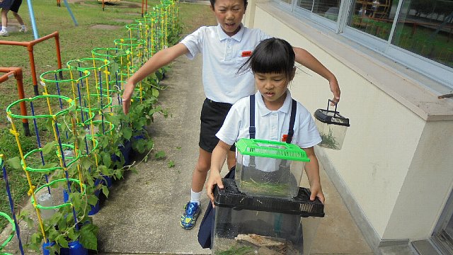 3年生が昆虫の勉強を始め、学校のまわりで虫網を持ってバッタを捕まえています。たくさん捕まえられるといいですね。