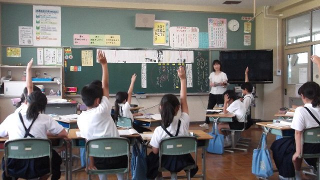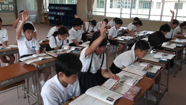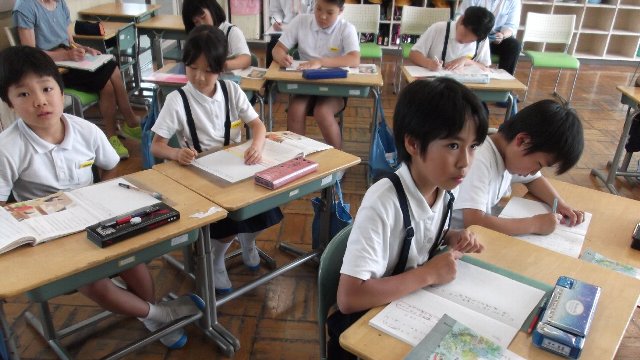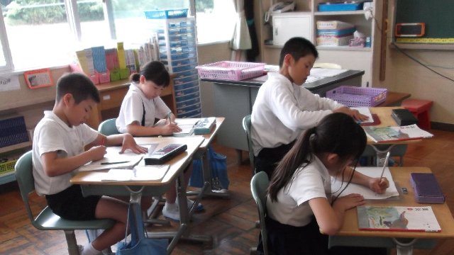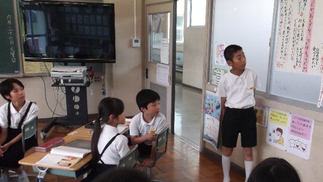 国語で迫力ある授業が展開されています。家族が戦争によって引き裂かれていく、たった一輪のコスモス「一つだけあげよう」お父さんがゆみこに伝えたかったメッセージは?活発な意見がたくさん出ています。写真の一人ひとりの表情からも読み取れますね。