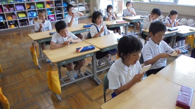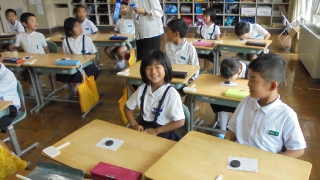 ここは2年生の教室。なぜか机の上にはビスケットが置かれています。このあと一口でほおばっておいしく食べました。