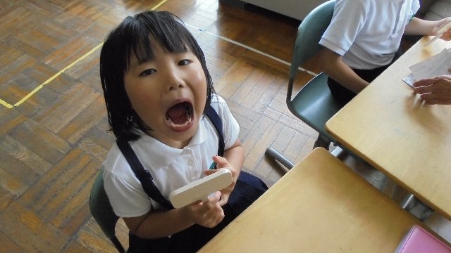 もうおわかりですね。そのあと口の中を手鏡で見てみると、歯の隙間に食べかすが残り真っ黒。ブラッシングの指導の一コマでした。お家でもきれいに磨けているか見てあげるといいですね。