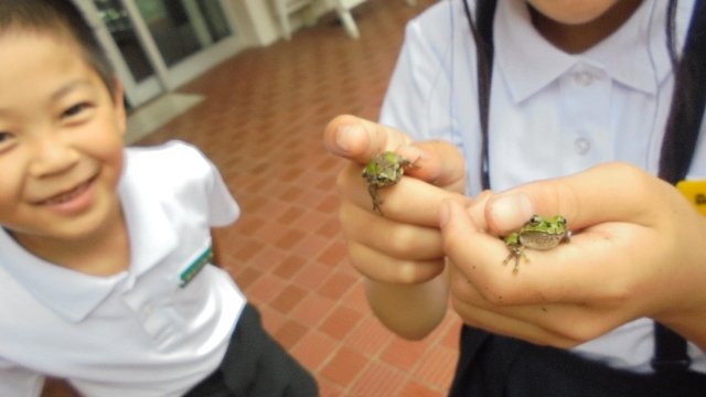 空梅雨ですがいつもの年のようにカエルが現れています。玄関のプランターにはかわいい小さなアマガエルが。みんなよろこんでつかまえ、かわいがっています!?