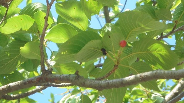 通学路桜並木のところで上を見上げれば、かわいらしいサクランボがなっています。大きくないけど、きれいなピンクです。スーパーでもサクランボがたくさん売られ、シーズンなのですね。
