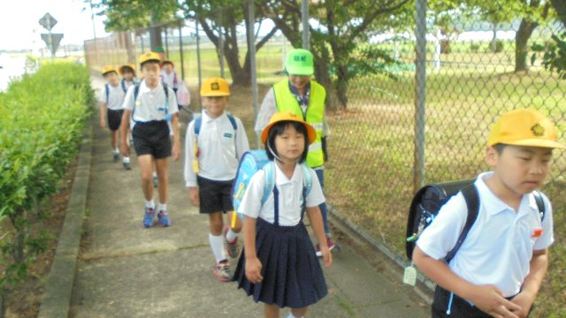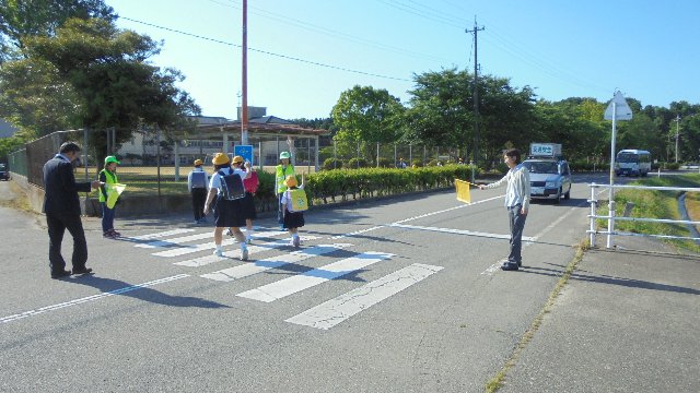 毎月1日と15日は安全協会や地域のボランティアの方が横断歩道に立って下さいます。ありがとうございます。子ども達はさわやかにあいさつをして通っていきます。写真はちょうどパトロールの車が止まって待ってくれています。その後ろにはスクールバスも。