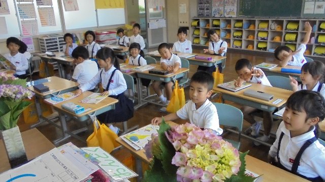1年生盛戸さんが家からアジサイを持ってきてくれました。登校時包んで大事そうに持ってきてくれました。お家の人が切って持たせてくれたのでしょう、ありがとうございます。