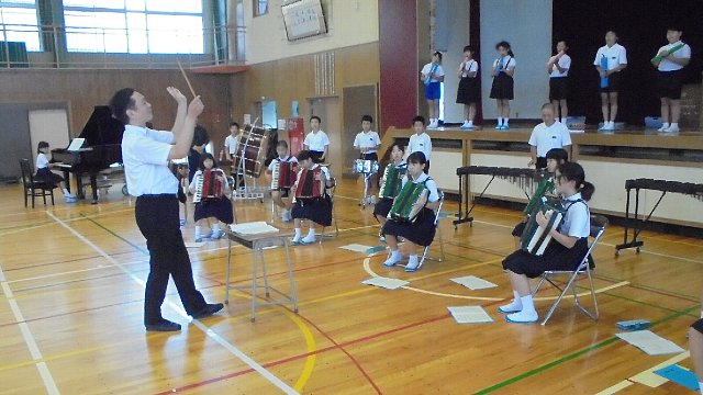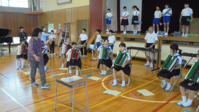 お一人は、コミスク学校運営協議会の畑山会長、地元にお住まいということもありお願いしています。もう一人は、高中の吹奏楽部顧問、吉本先生です。お二人から指導していただくと子ども達が見?違えるように上達します。子ども達自身がそれを実感しています。