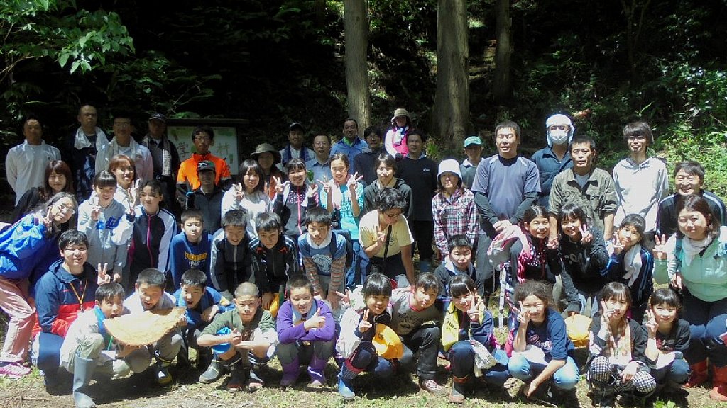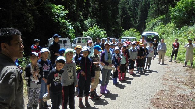 途中休憩時間には、森林組合の高野さんが木の伐採のデモンストレーション、実際にチェーンソーで木を切り倒して下さいました。下草刈り、歩道の修繕、アテの木の起こし、今年も子ども達によって引き継がれました。この子達が親になったときまたこの地を訪れ、なつかしく思い出されるでしょうか。