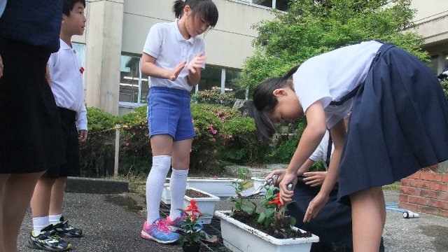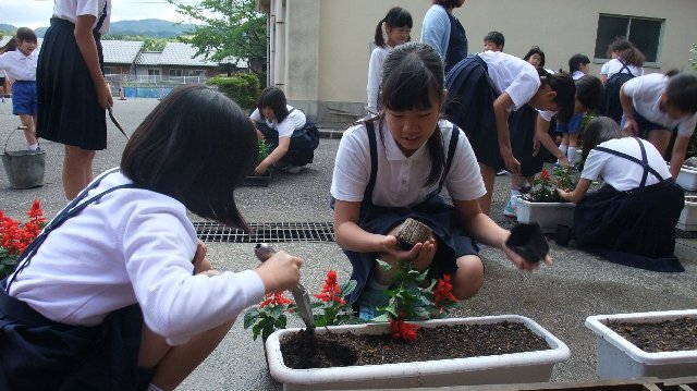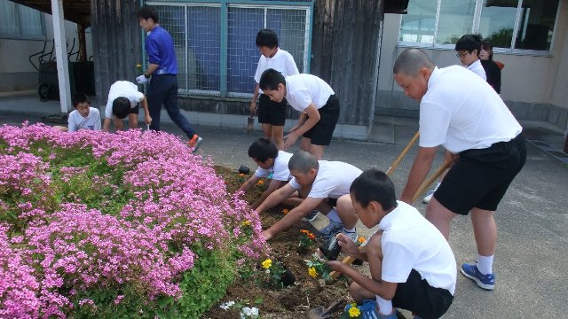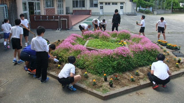 長休みにサルビアをプランターに、マリーゴールドを花壇に植える作業をしました。この花壇は去年まで粘土質で水はけが悪く植物が育たない花壇でした。春に客土をしました。今年はどうか楽しみです。高学年に呼びかけたところ、さわやか委員会が中心にたくさんの子ども達が参加してじょうずに植えることができました。