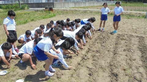 午前中の長休みは、プランターにサルビアの苗植えをしました。お昼休みは、畑でひまわりを植えます。ちゃんとさわやか委員の瀬戸さんが校内放送で低学年に参加を呼びかけてくれました。