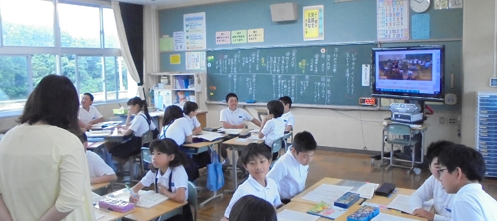 今日の教室紹介は6年生です。落ち着いた中、国語の学習をしていました。話し合いの進め方を学び実際にやってみる。テレビを見るとデジタル教科書が映し出されていました。動画を活用しているようです。
