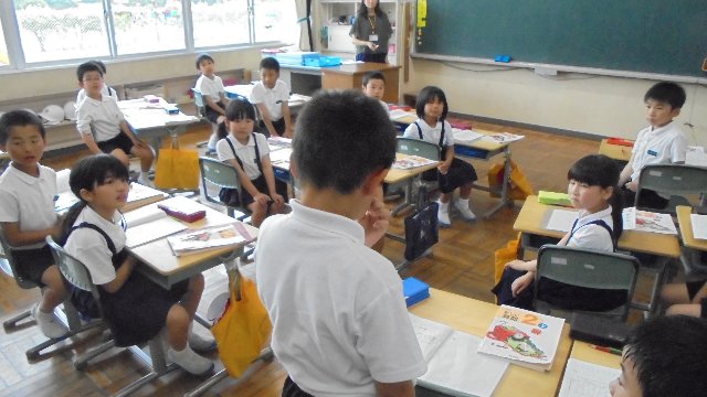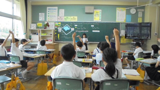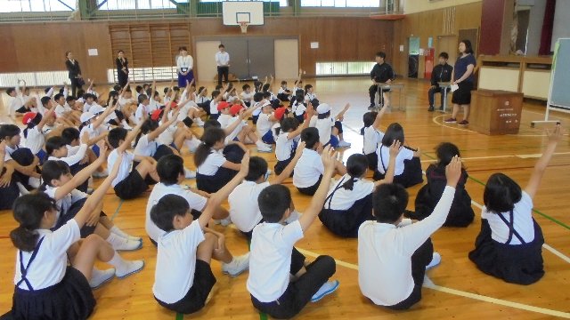 内容は、話し方大会リハーサル、器械運動リハーサル、激励の言葉、校長の話、生活指導の話、今月の生活目標の話、学習部からの話の聞き方寸劇。どれも楽しいものばかりで時間を超過してしまいましたが、長い時間きちんと話を聞ける姿が立派でした。また、去年から始めた取り組みなのですが、聞くだけで受け身の集会に終わらせず、自ら進んで意見を発表する集会にしています。写真を見て下さい。体を向けて人の話を聞いています。たくさん手を挙げています。堂々と意見を述べています。すばらしいですね。こういうことが当たり前になされていく学校だと実感した時でもありました。