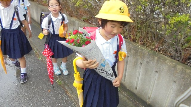 ありがとう、きょうかさんがお家からまた花を持ってきてくれました。教室には花があったので、職員室に届けてくれました。早速、教頭先生が学校中の手洗いに活けてくれました。校内放送でも紹介しました。