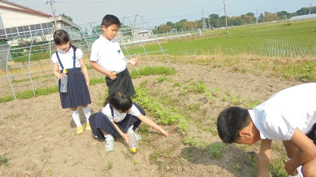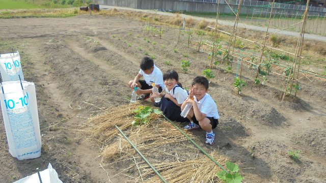 雨の日が少なかった5月です。子ども達は朝から大忙しです。1年生は、教室外の朝顔に、2年生は苗植えをした野菜物に、さわやか委員は玄関のプランターに、そのほかの学年も理科で学習しているヘチマやホウセンカなどに・・・ペットボトルやじょうろで水やりです。