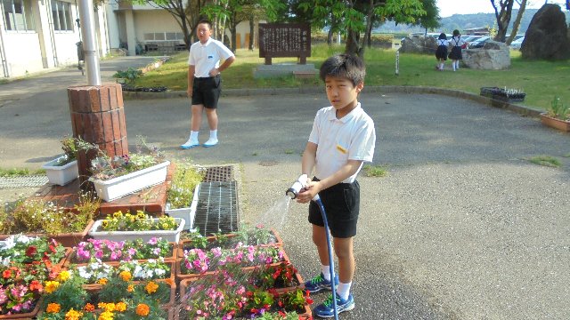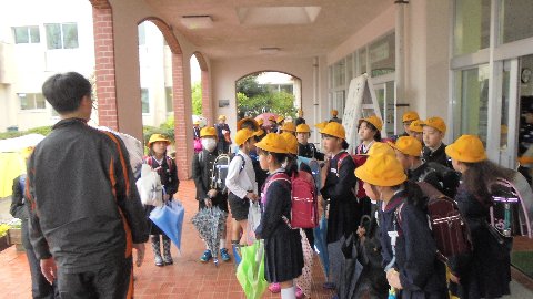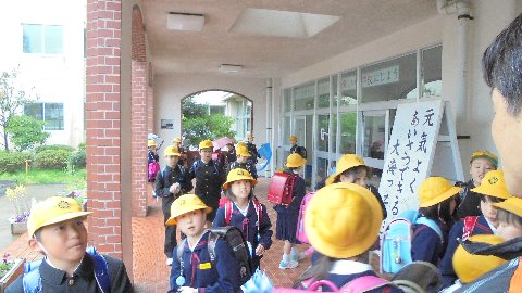 この日は、中・高学年が一緒に帰る日でした。玄関で地域ごとに並んでそろって先生に帰りのあいさつ。「さようなら。」「気をつけて帰ってね。」毎日の風景です。