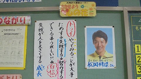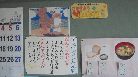 教室の掲示を見るとどんな学習したか分かります。1枚目は、1年生が先生の名前のサインを集めていましたね。2枚目の写真は各教室にある道徳の学習の足跡です。アンパンマンを学習したのは、えーと何年生だったかな。松岡修造は4年生?