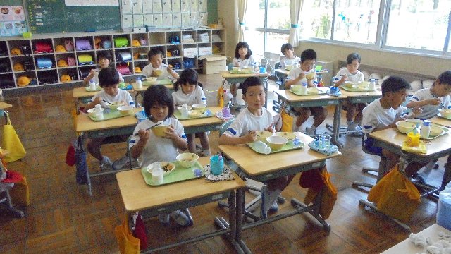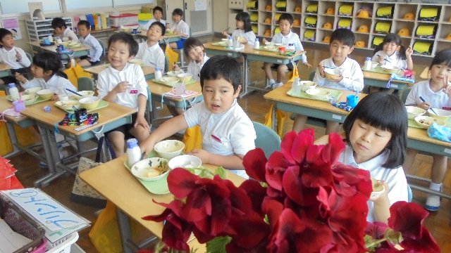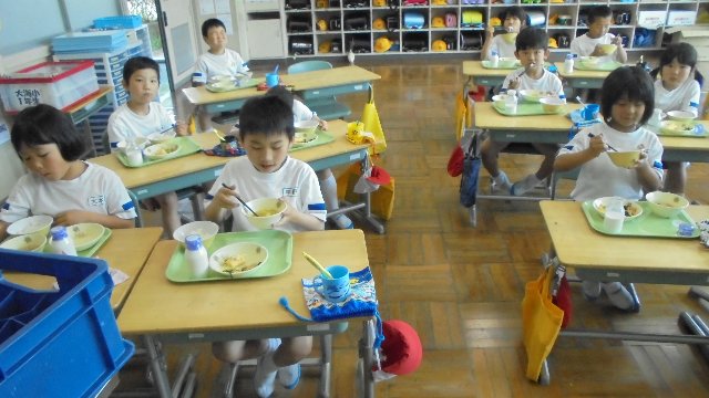1.2年生の給食の様子をのぞいてきました。みんなもりもり食べていました。元気いっぱいです。楽しい校内放送が流れ、団らんのひとときとなっています。