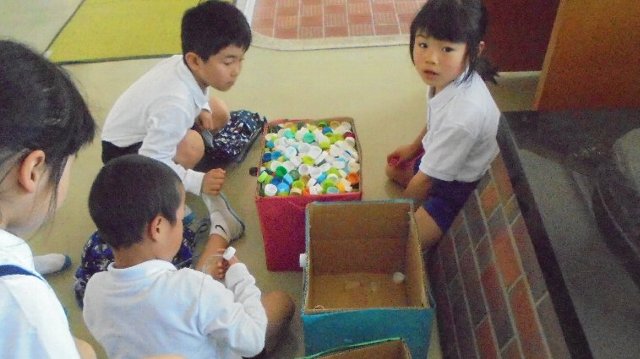今年も集めています。種類に分けています。1年生は初めての経験なので特に興味を示しています。何をするのか上級生にしっかり習ってね。