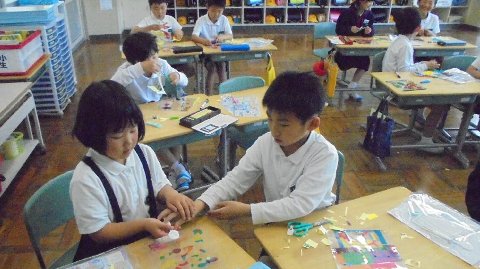 2年生は図工で内輪を作っています。カラフルです、透明です。そろそろ使う季節ですね。吸盤にぶら下げて窓に飾られています。
