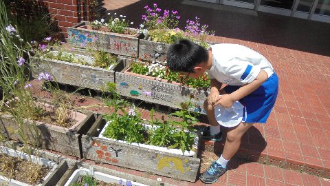 朝休み、毎日のように1年生の麻生さんが玄関プランターの草むしりをしてくれます。楽しそうにしてくれます。ありがとう。それにつられて友だちも草むしりをしてくれます。おかげでプランターがきれいです。