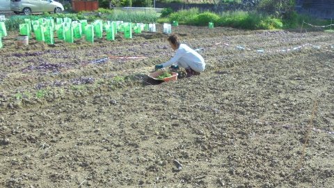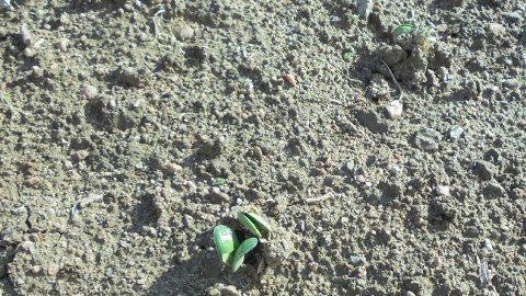 先日植えた大豆の種が発芽していました。髙﨑名人にたずねると、このあとカラスや鳩がついばみに来るので油断できないらしいです。畑の場所は集団登校の集合場所になっているので、子ども達は毎日観察しています。