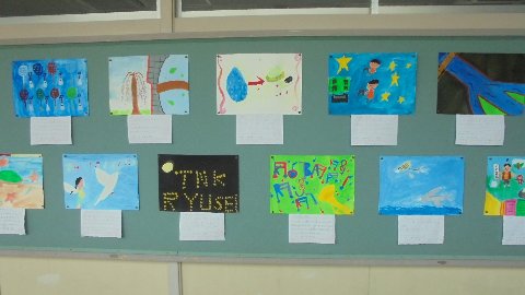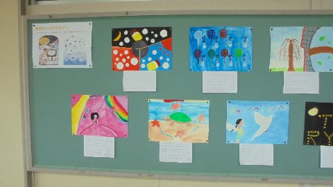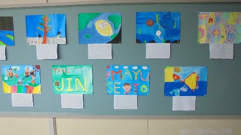 学年の掲示板です。 クラス全員の作品を写真に撮りました。どの絵がお子さんの作品かわかりますか。これは聞いてみなくては!