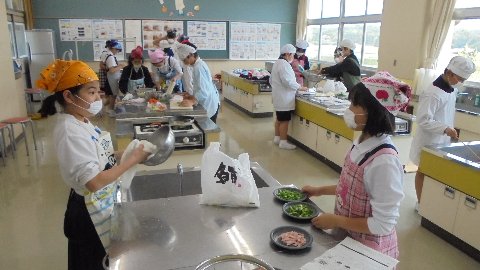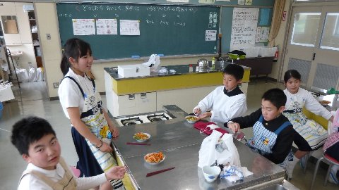 今週6年生の家庭科は調理実習でした。なにやら家庭室からいいにおいがしてきました。おいしくできたかな?何を作っている写真かわかりますか?
