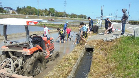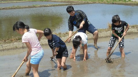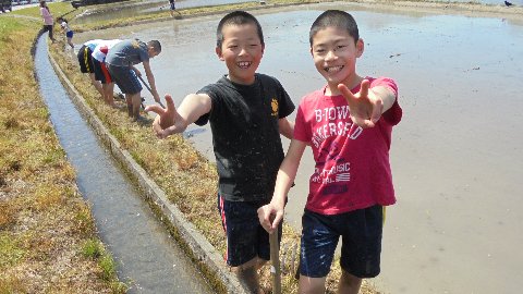 田に囲まれた学校で勉強していながら、たんぼに入ったことがない子がほとんど。今年もそうでした。鋤をつえのようにしておそるおそる、へっぴり腰で入って行きます。田の中のヒルに驚いて大きな声、毎年の風景でした。でも、しっかり木本さんの話を聞き、田植えに備えて泥をならしていました。だいぶなれましたね。本番の田植えはだいじょうぶ(笑)