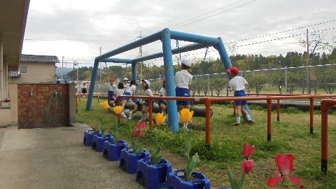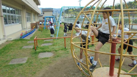 登校するとすぐさま思い思いの遊び場所に一直線、学年や季節、そしてその子によってお気に入りの場所が違います。近頃人気は1階教室前に面した遊具広場、1年生がいるので上級生が遊んであげているほほえましい様子が見受けられます。体育館ではドッジボールで激しい戦いが繰り広げられています。