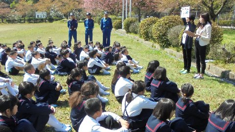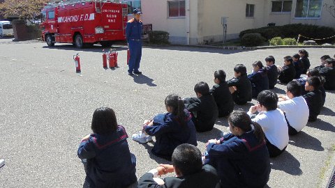 運動場に避難した後、消防署高松分署の方からほめていただきました。その後場所を正面玄関に移し、消火器による初期消火の訓練も体験させていただきました。おいそがしい中大変お世話になりました。ありがとうございました。