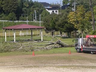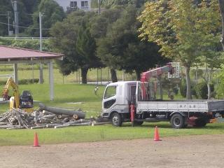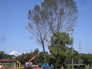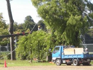 とても大きく立派な木でもったいないですが、子どもたちが安全に運動、遊びを行えるようにするため、運動場の老朽化したポプラの木を伐採しました。とても大掛かりな伐採作業でした。