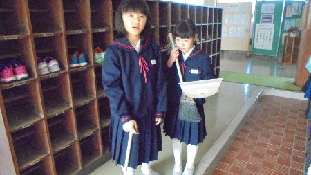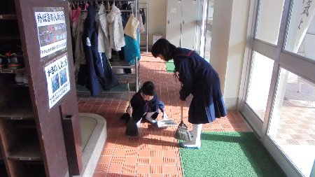 登校日の朝、玄関掃除に取り組んでくれる二人。4年生のOさんとOさん、聞いてみると一人は昨年のさわやか委員会、もう一人は友達を手伝って朝の奉仕活動。素晴らしいですね。玄関掃除がもうしっかり身についているんですね。ほんとうにありがとう、えらいです。こんな姿が来年度もたくさん見られると良いですね。