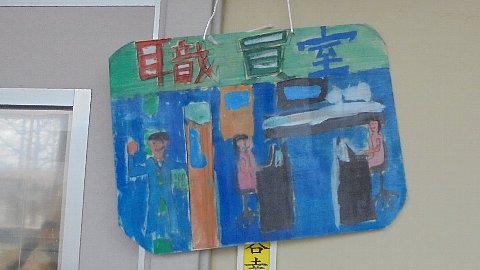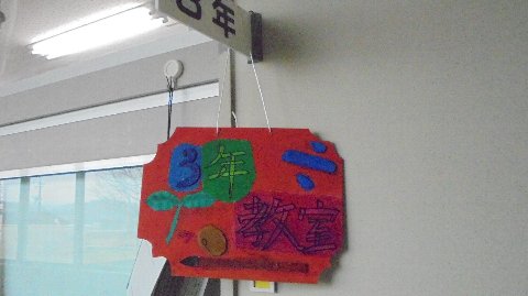 図工で5年生が教室を案内する看板を作りました。早速各教室前にかけてくれました。だれがどの教室のを作ったのでしょうね。お家で話題にしてみて下さい。