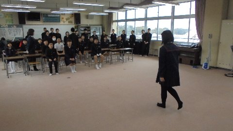 卒業式の練習をしているではないですか。5年生の伴奏に合わせ、6年生が歩く練習をしています。なーるほど、卒業式の入退場練習なのですね。ここなら温かくていいですね。あと1週間みんな健康には気をつけないとね。風邪引かないようにね。