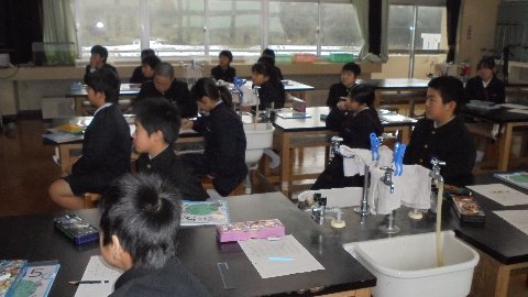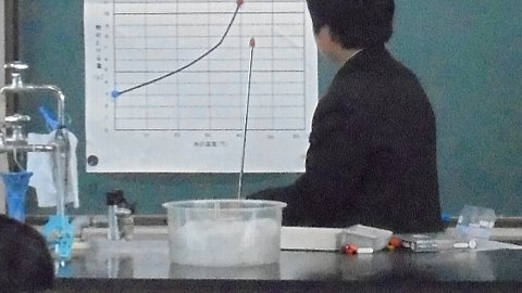 理科室でものの溶け方の学習をしています。水を温めるとみょうばんがたくさんとけます。冷やすと・・・このとき役に立ったのが日陰に残っていた雪。氷の代用です。役に立ちました。工夫していますね。さて、肝心の結果はどうなりましたか。