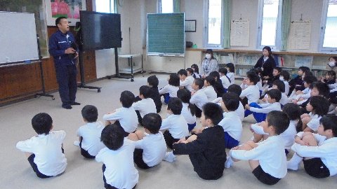 訓練の後は、米倉警察官のお話をしっかり聞き、教室でそれぞれふり返りをしました。学校だけでなく、ご家庭でも不審者の侵入がニュースで流れています。一人で留守番をしているときどんなことに気をつければ良いか、ご家庭で話し合ってみて下さい。