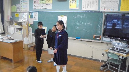 2年生の教室の中では昔話の劇練習。おやっ、桃から生まれるのは桃太郎ではないですか?