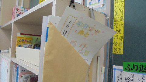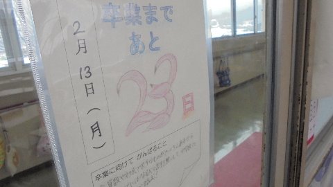 教室の入り口にこんな張り紙が・・・残りの日数だけでなく、卒業に向けてがんばることが書かれています。1枚1枚丁寧に仕上げられています。教室の中には明日からの分まで用意されています。