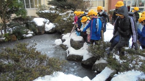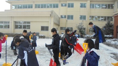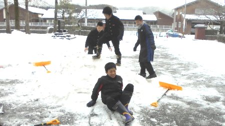 毎日、氷の世界です。今朝も積雪があったので、6年生が総出で除雪してくれました。そばで他の学年の子どもたちも手伝ってくれてほほえましかったです。