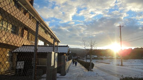 久しぶりにきれいな朝日が見えたけど、昨夜の冷え込みで氷の世界となりました。子どもたちはボランティアの方に見守られながらすべって転ぶこともなく安全に今日も登校できました。ちょうどこの時期、こどもたちの登校時刻と山際から朝陽が昇ってくる時刻と重なりとてもきれいで気持ちよいです。