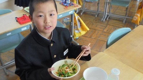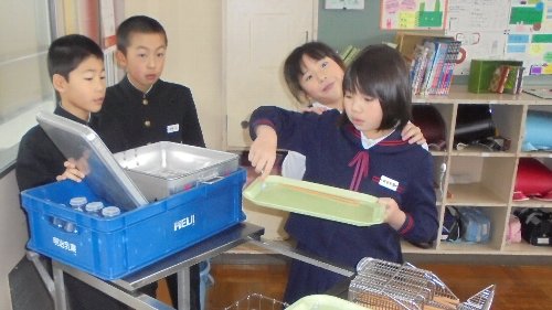 2017年1月24日 15時48分 給食時間に4年生の教室をのぞきました。もう食べ終えて後片付けしてしている中にさらにもりもりともられた野菜を食べているTさん、おかわりして教室として完食する、素晴らしいですね。後ろでは人気の蜂蜜カステラをめぐってじゃんけんバトルが(笑)