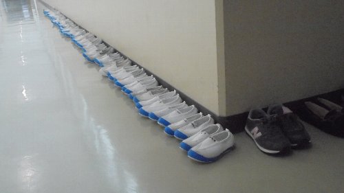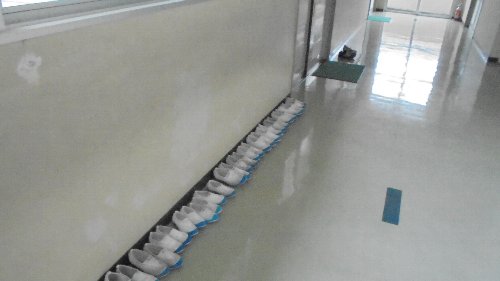 左の写真は、1月17日昼休みの低学年お話会のときの会議室前廊下。右側の写真は、1月19日2限目音楽室前の廊下。全校児童が集まるときも、クラスで授業をするときであろうが同じ。素晴らしいです。以前教室や体育館でのランドセルの並びも紹介しました。いつも同じ景色で心が洗われます。