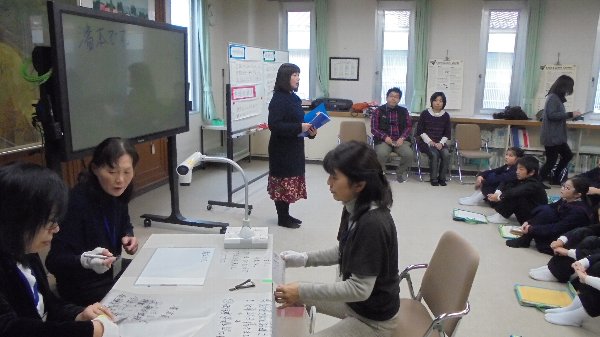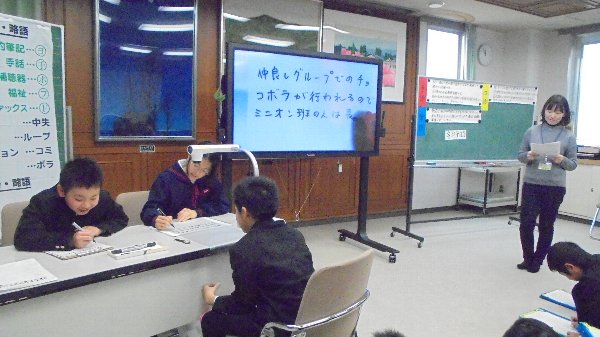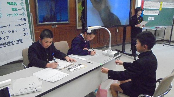 今回は、市の社会福祉協議会のご厚意で特別に「要約筆記」に携わっているメンバーをお招きすることができました。写真で役割内容が伝わるでしょうか。耳の不自由な方のために、話に合わせその内容を文字にしてお知らせすることです。いわゆる同時通訳視覚版のようなものです。1分間に60文字も書いて伝えていきます。子どもたちも体験させていただきました。3人1組で役割が決まっています。