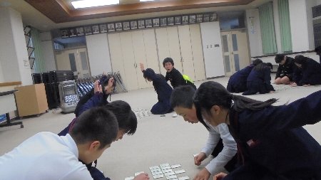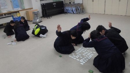 会議室から赤池先生の百人一首を読む声が聞こえてきます。ドアを開けると6年生が取り札を囲んで頭をつきあわせて、真剣に・・・6年間続けてきたことだけあります。どのグループも速い速い、あっというまにとってしまいます。もうすぐ校内百人一首大会です。だれがチャンピオンに輝くのでしょうね。低中学年も張り切って練習しましょう。