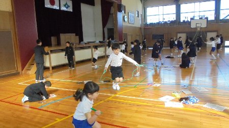 今日の長休みは、月曜に引き続きなわとび運動で体力づくりをしました。短いなわで一人ひとりがカードを使ってめあてにむかってできる技を増やしていきます。長休みだけでなく、体育の時間や休み時間にもがんばっています。朝休みは体育館の後ろギャラリーがなわとびコーナーになっていていっぱいになります。
