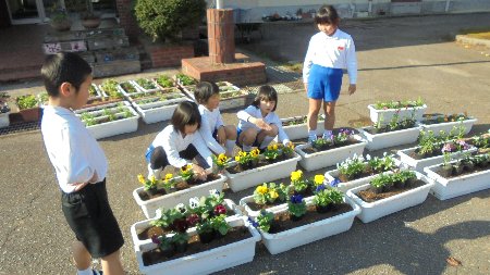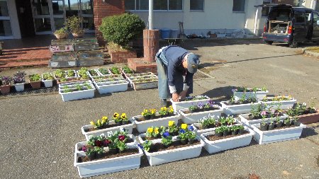 先週の寒波や積雪がうそのように今日は暖かな良い天気になりました。荒天であきらめかけていたプランターの植え替えを一気に行いました。いつも支援して下さる園芸アドバイザー?の道原さんが午前中に花苗を持って下さいました。お昼休みには「ちょこボラ」を呼びかけて苗植えをします。