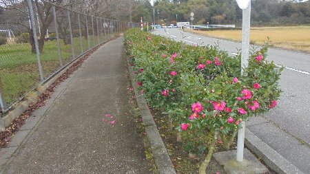 学校の周りにある歩道わきに植えてある街路樹が花をつけ始めました。山茶花の赤い花です。これからどんどん花が増えそうです。この花の上に雪が積もる季節がもうそこまできているのですね。