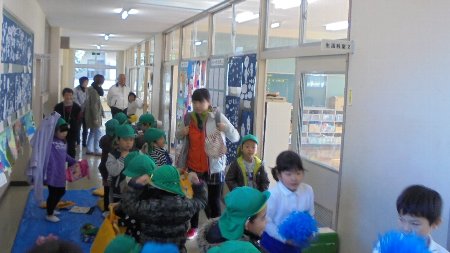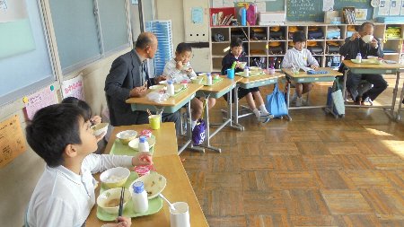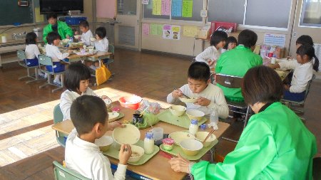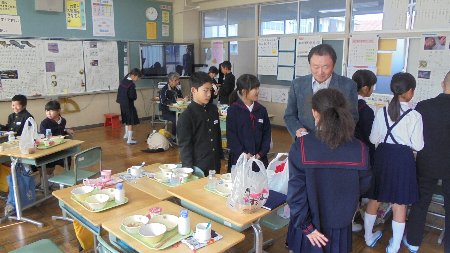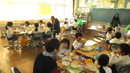 各クラスで子どもたちと一緒に給食を食べていただきました。グループに、大きな輪になって、話が弾んだようです。手紙と一緒にシクラメンの花を持って帰ってもらいました。4年生が味噌(3年生の時に地域の方と一緒に作った)もプレゼントしに各教室を回りました。