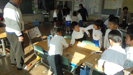 1,2年生の昔遊びコーナーです。保育園のこどもたちに遊びを教えました。おじいちゃんおばあちゃんと一緒にできて楽しかったです。