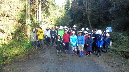 良い天気になりました。たくさんの参加者があり、バス2台で野寺の学校林に向かいました。一番入り口に近い大きな杉を切り倒すのを見学しました。大きな音とともに直径70cmもあろうかという大木が森林組合の職員の方の手で伐採されました。すごい迫力にみんなびっくり!入り口を登り頂上では木の引き上げ体験をしました。みんなでロープを引き切った木を運んでみました。