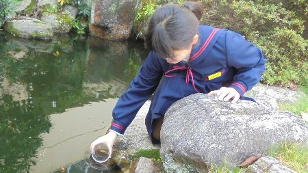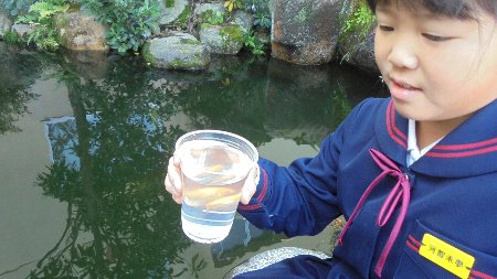 学校の前庭にはメダカ池があって、この夏から一匹だけ金魚がいます。一匹だけなのでいつもさみしそうでした。それを見た3年生のKさんは、家から大切に育てているペットの金魚を連れて一緒にしてくれました。それも2匹、家の金魚がさみしくないように。とってもやさしいね。これから3匹仲良くしていくことでしょう。大事な金魚を本当にありがとう。