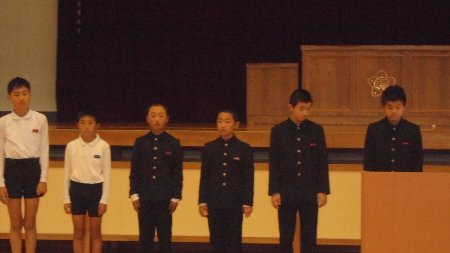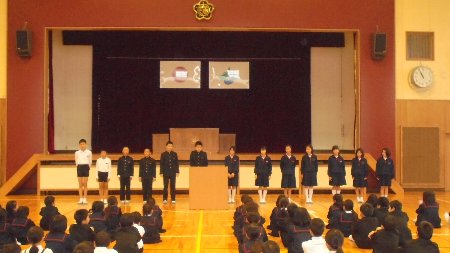 毎月1日は、全校集会です。月に一度一堂に会して学校への所属意識が高まり、学校全体が家族のようになります。
